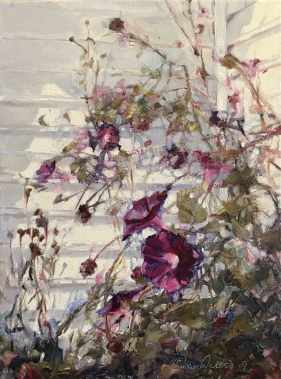Morning-Glories-III,-Susan-Duke-Waters Published October 8, 2019 at 1421 × 1920 in Morning Glories, Ipomoea purpurea Morning Glories III, plein air in oil.
