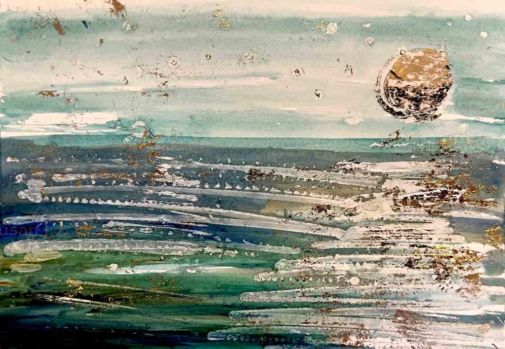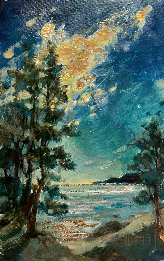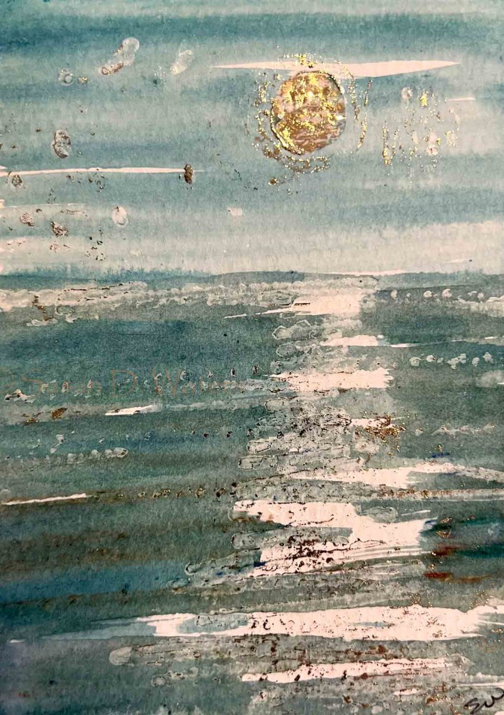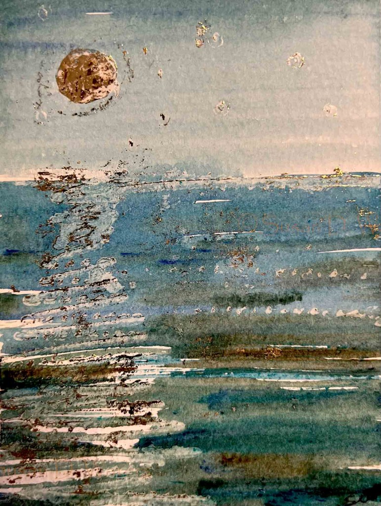 I painted cards to experiment with gold leaf. It was fun, but am not sure whether I’d use it in a regular landscape painting as I found it unpredictable (tiny stars, fire sparks… maybe?). Depending on the viewer’s angle of available light, the gold is dark or light, altering the composition.