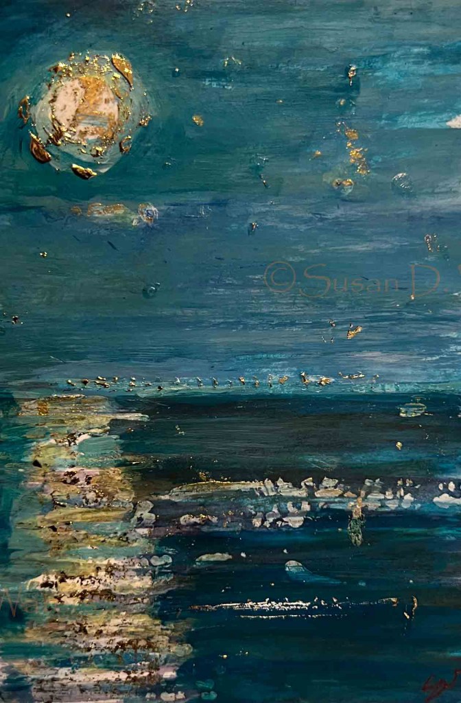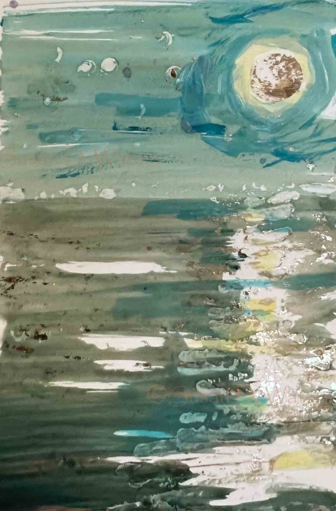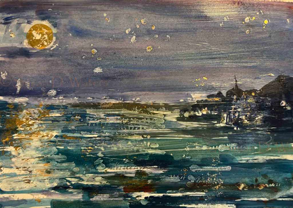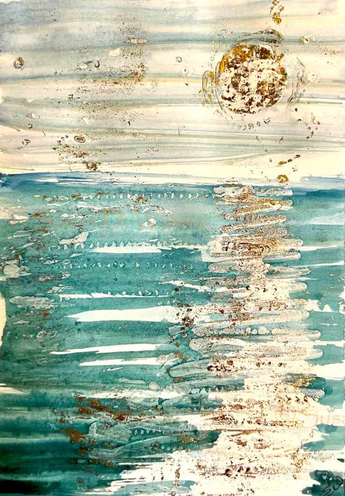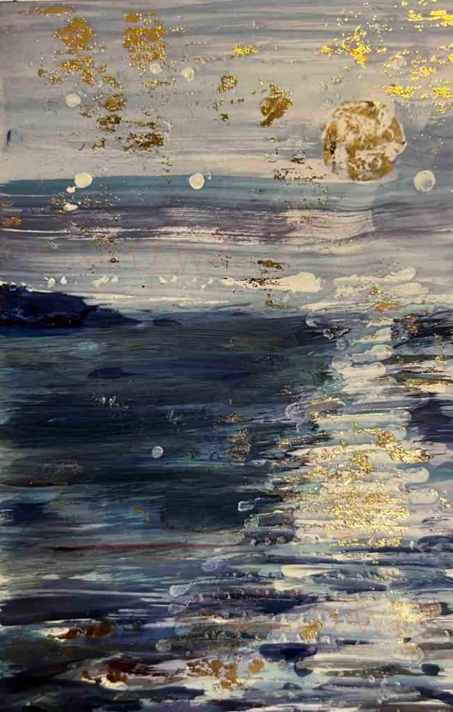 I painted cards to experiment with gold leaf. It was fun, but am not sure whether I’d use it in a regular landscape painting as I found it unpredictable (tiny stars, fire sparks… maybe?). Depending on the viewer’s angle of available light, the gold is dark or light, altering the composition.