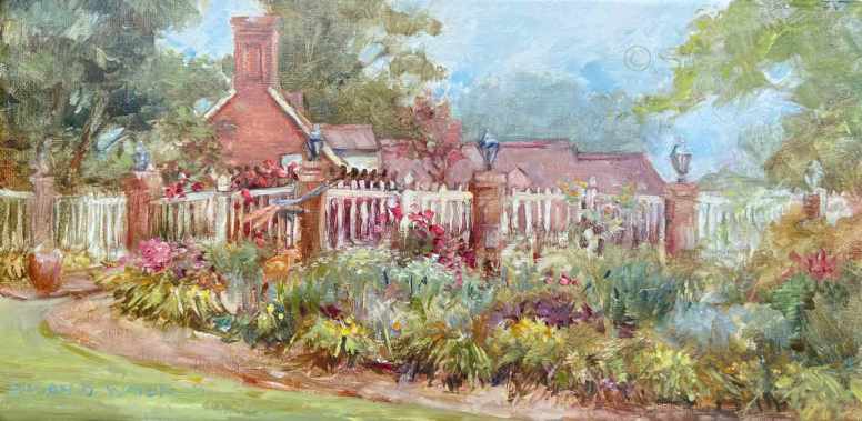vickis-gardens-susan-duke-waters Published May 14, 2022 at 1920 × 940 in Magnolia Garden Club Vicki’s Garden, Plein air in oil. Sold.