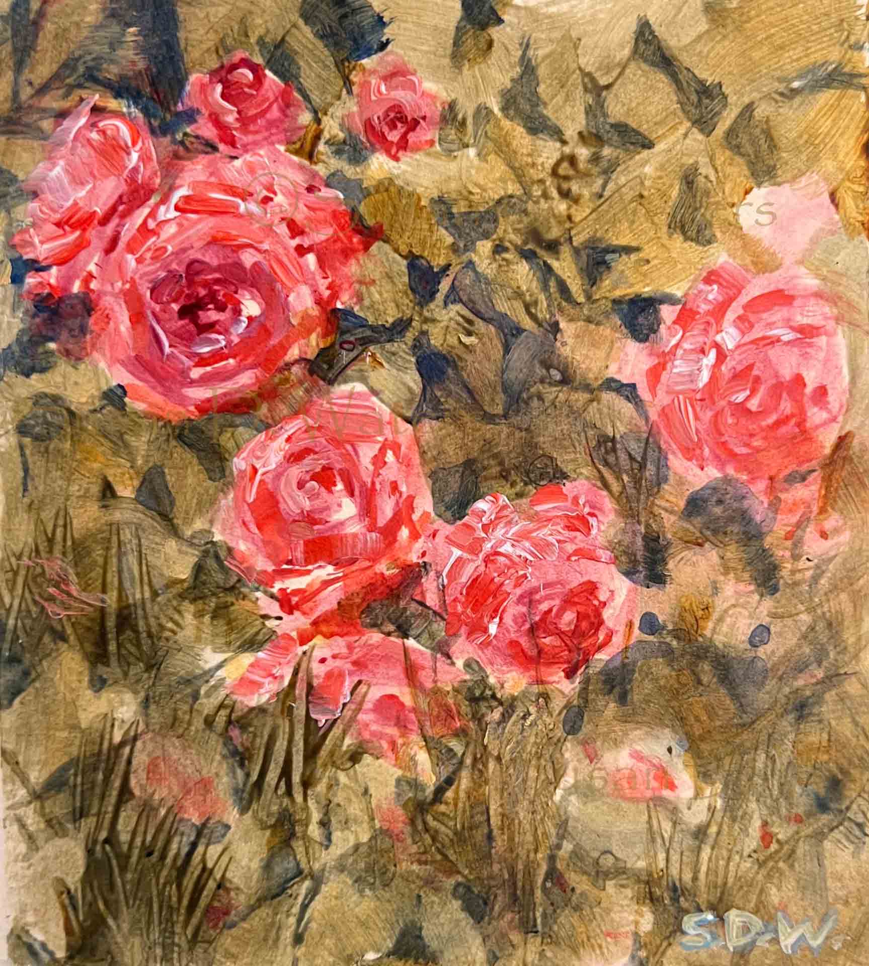 roses-i-susan-d-waters Next Published June 3, 2022 at 1727 × 1920 in Painting Petals Carpet Rose study, in acrylic 5″ x 6″
