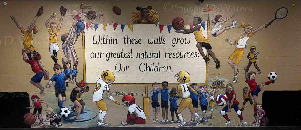 Painted to completion. The mural depicts the various activities the center provides along with the wording provided by the director. The boy batting is painted in a hallway to the left and is playing with the two children on the far left of the main mural. Special thanks to the City of Rockmart and the Recreation Department Staff.