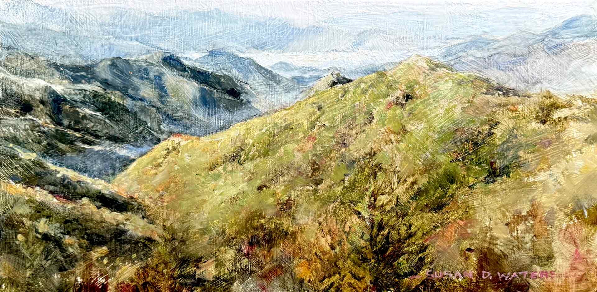When-the-World-was-Young,-Susan-D-Waters Published October 4, 2024 at 1920 × 940 in Smokies: Morning over the Oconoluftee Valley “When the World was Young” Great Smoky Mountains National Park, plein air.