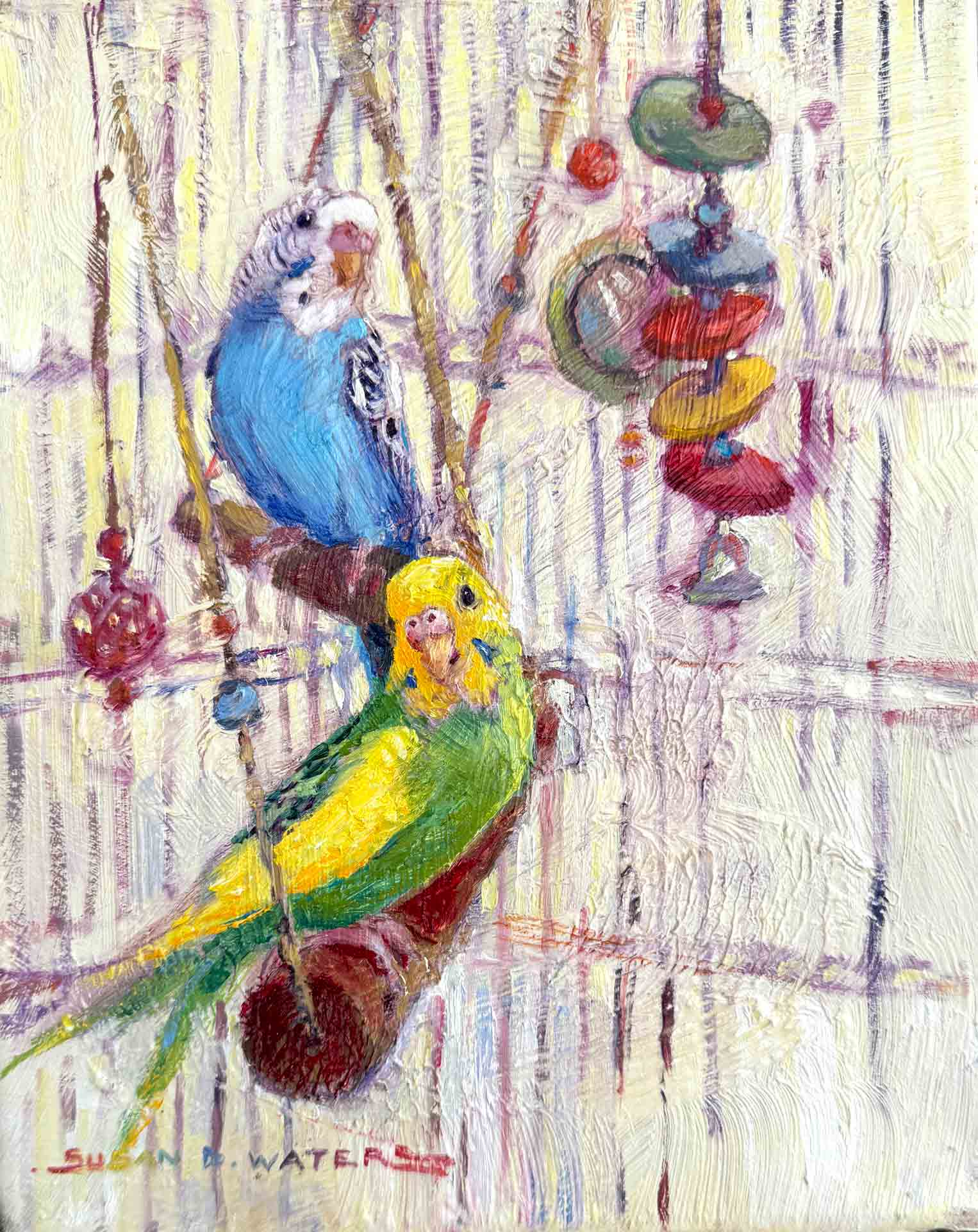 Flight-Control,-Susan-D-Waters Published April 15, 2025 at 1526 × 1920 in Flight Control Budgies, 12″ x 9″