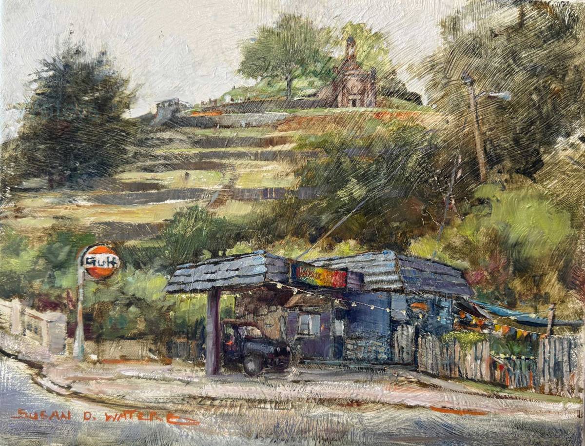 Myrtle-Hill-and-Cosmic-Dog-Outpost,-Susan-D-Waters Published September 1, 2025 at 1920 × 1463 in Myrtle Hill and Cosmic Dog Outpost Myrtle Hill Cemetary, Rome, GA, 12″ x 12″, plein air in oil.