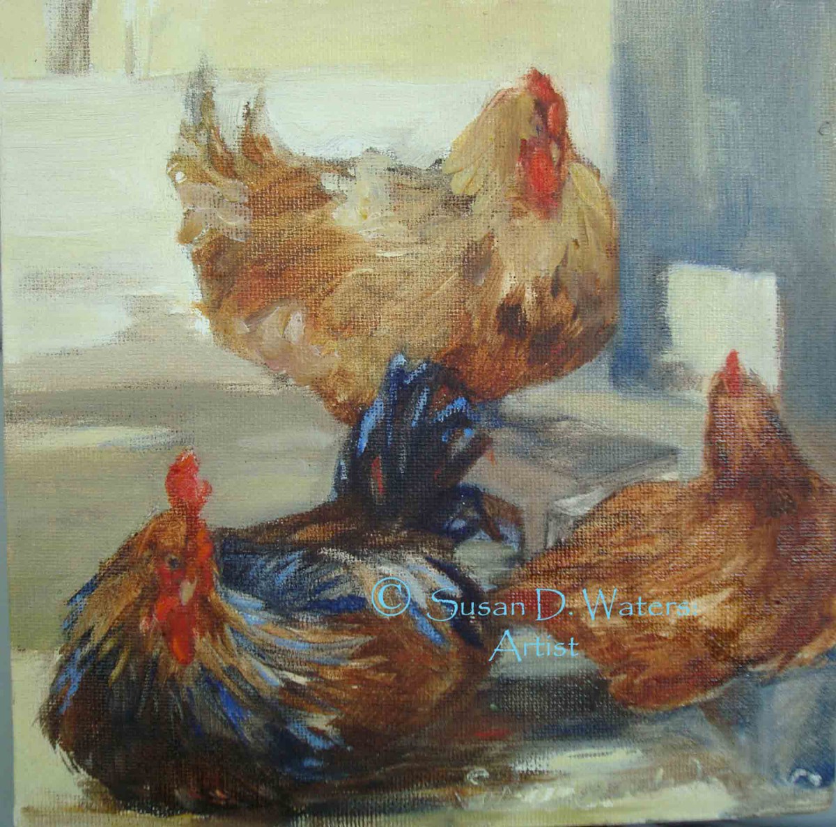 Barnyard series; Chickens resting Published May 3, 2017 at 1920 × 1900 Trio of chickens resting after a feast of watermelon rind painted plein air; oil on canvas panel 8″ x 8″