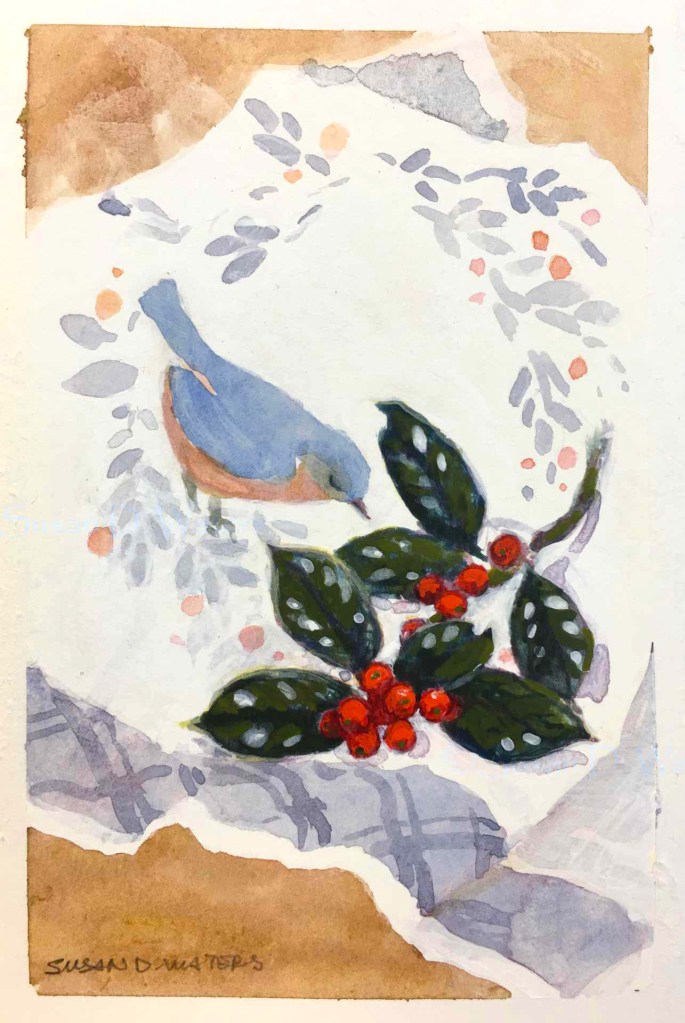 #3. Holly with Bluebird Motif, in acrylic (card).