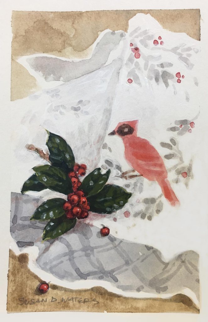 #2. Holly with Cardinal Motif, Christmas tea towel and holly sprig, in acrylic.