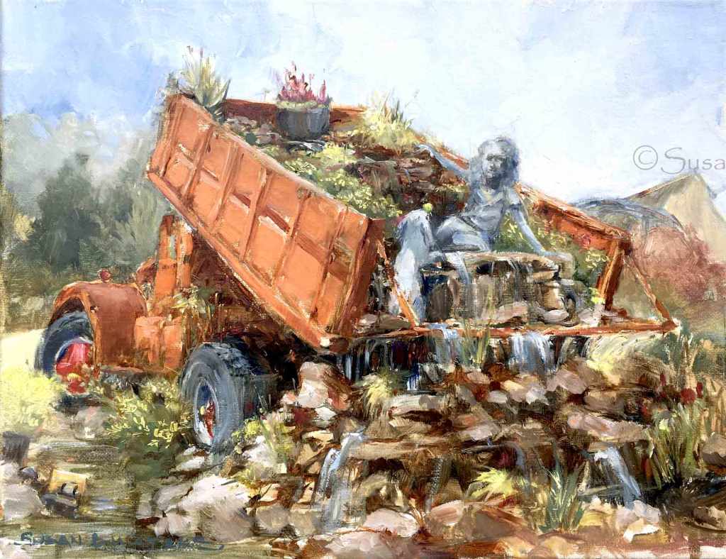 #85. Magnolia Garden Club Annual Pond and Garden Tour, 2021, waterfall and sculpture at one of the featured homes “Lucky’s Load”, plein air, in oil. (Special “thank you” to organizers and hosts.)