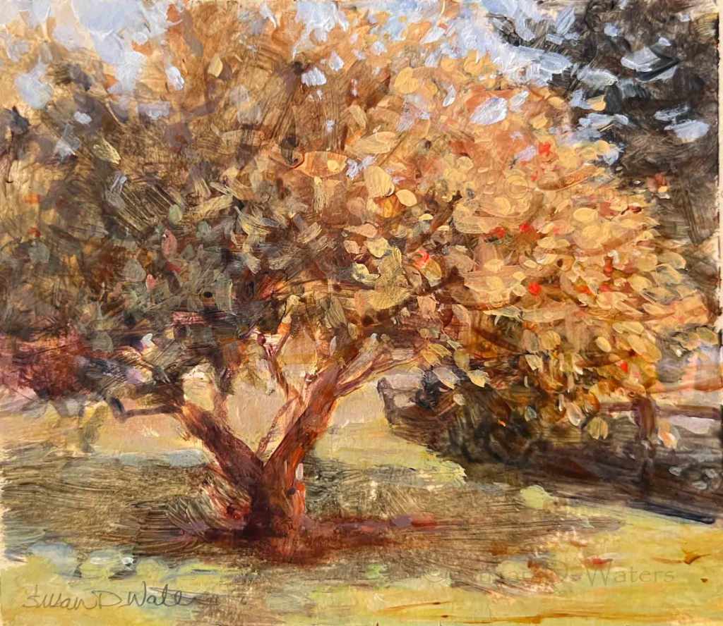 #38. Crabapple in May, plein air in acrylic, 5″ x 6″.