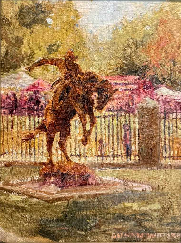 #4. Plein Air Painting at the Booth western Art Museum of the bronze sculpture “Into The Wild” by Vic Payne, 8″ x 10″, in oil, available for viewing and purchase at the Downtown Gallery, Cartersville, GA.
