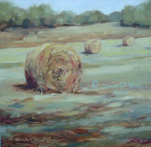 - HAY BALES II: Rolled hay bales in summer afternoon sun. Painted en plein air. Oil on canvas panel, 12″ x 12″