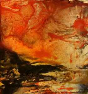 - Shepherd’s Delight, an encaustic painting of a sunset over a shepherd’s cottage. 11″ x 11″