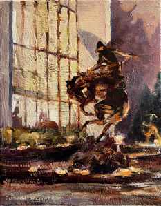 - “Night Rider” Booth Western Art Musem, featuring the sculpture “Attitude Adjustment” by artist Austin Bartin., plein air nocturne, 8″ x 10″