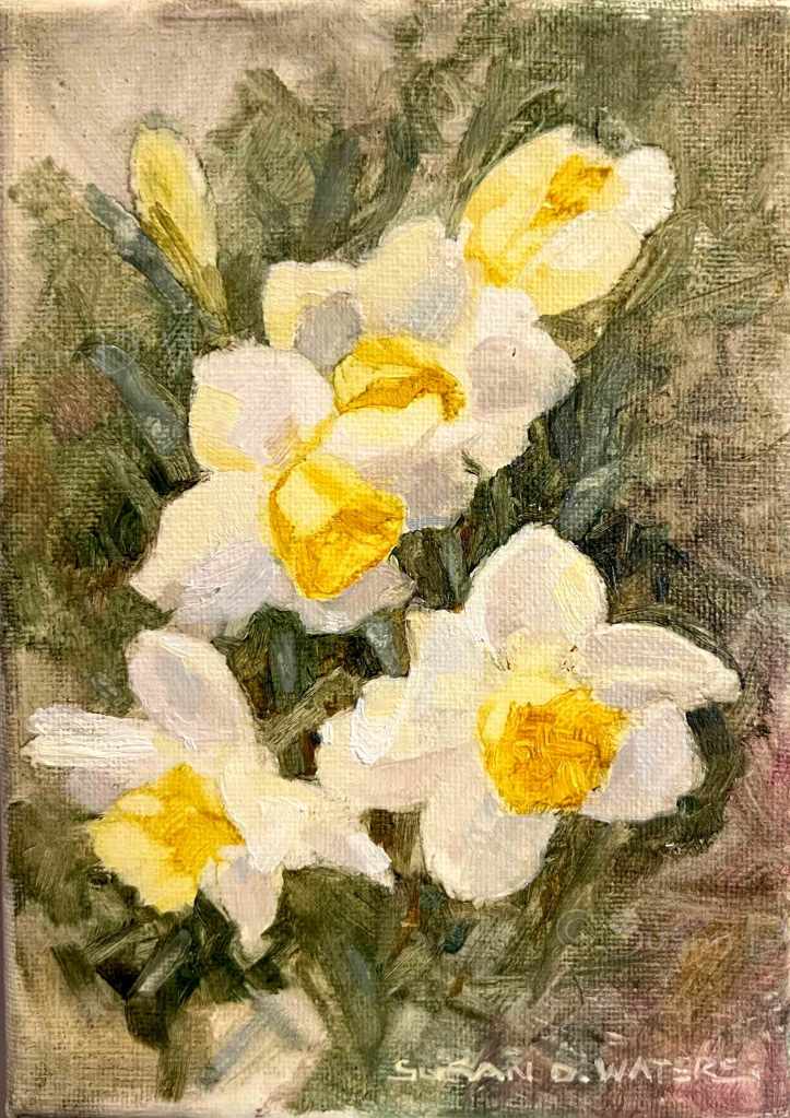 Jonquils March 21, 2023March 20, 20231 Comment #5. Daffodil Shower, 8″ x 10″, in oil, Painted in the rain.